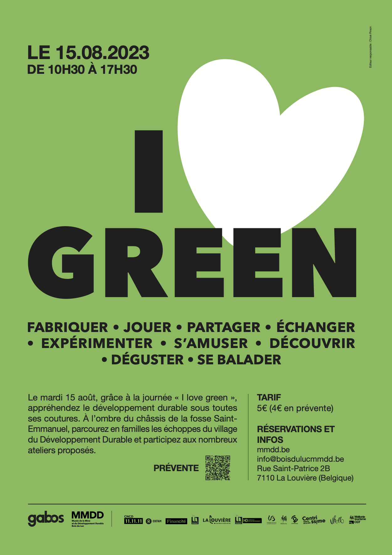 Fabriquez, jouez, partagez, échangez, expérimentez, amusez-vous, découvrez, dégustez et baladez-vous. Le mardi 15 août, grùce à la journée « I love green », appréhendez le développement durable sous toutes ses coutures. Parcourez en famille les échoppes disséminées dans les espaces verts de la fosse Saint-Emmanuel et participez aux nombreux ateliers proposés. Vous pourrez y fabriquer des objets pratiques et durables et vous informer sur les opportunités liées au basculement vers un modÚle plus respectueux de notre planÚte et des ressources naturelles.
