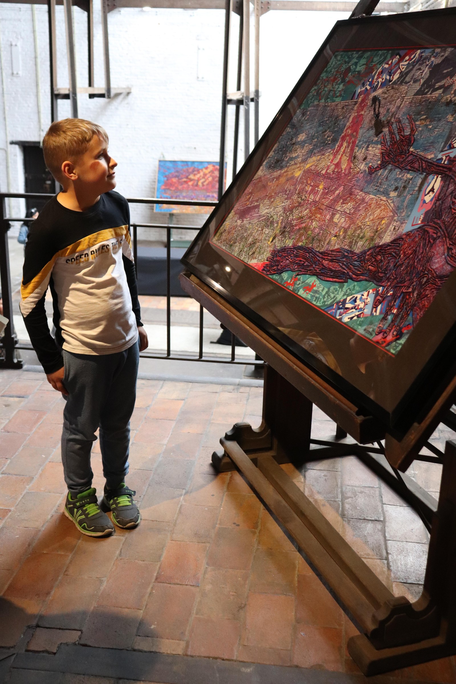 Le grand jour est arrivé : les enfants découvrent l’exposition de Daniel Pelletti. Un premier contact pour la plupart avec l’art ; la spontanéité est de mise en abordant les œuvres. Avant d’entrer quelques consignes s’imposent : sur le terril, on courait et on touchait tout ce qu’on voulait ; dans une exposition, on est calme, on se tient à distance des œuvres pour ne pas les abîmer. Deux univers complètement différents. Les enfants sont fiers : ils ont la chance de découvrir l’exposition en primeur, avant les journalistes et les autres visiteurs ! Ils ont également la chance de découvrir les coulisses du montage d’une exposition : les préparatifs ne sont pas encore tout à fait terminés.